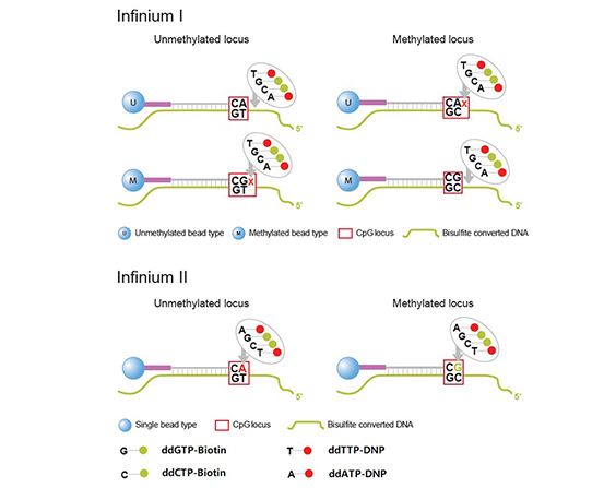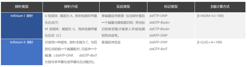 850K芯片沿承了Illumina应用在450K芯片中经典的BeadArray技术,通过Infinium I及II探针设计,在对目标区域全面覆盖的同时也保证数据稳定可靠。Infinium I的设计是通过两种不同的探针的信号值来区分甲基化的CpG位点(C)和非甲基化的CpG位点(T)的比例;而在Infinium II的设计中,每个检测位点只设计一个探针,通过比较该探针掺入的两种荧光的信号值来计算目的位点的甲基化比例。